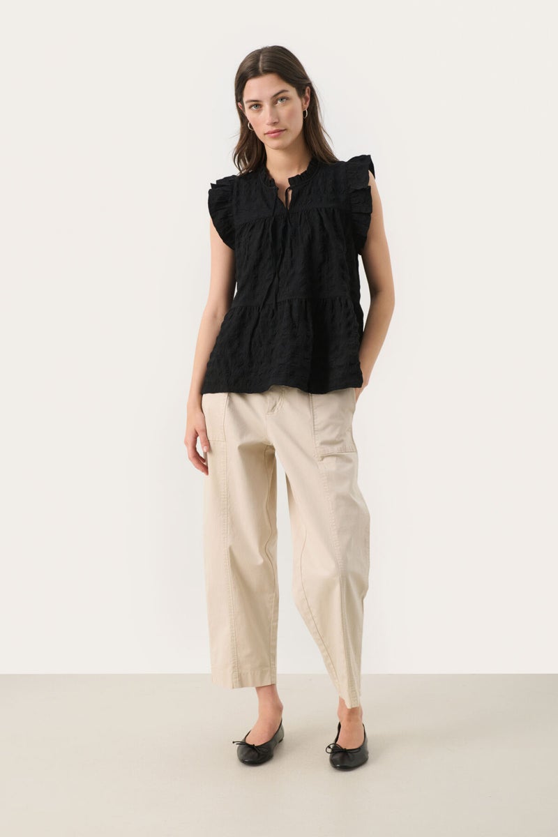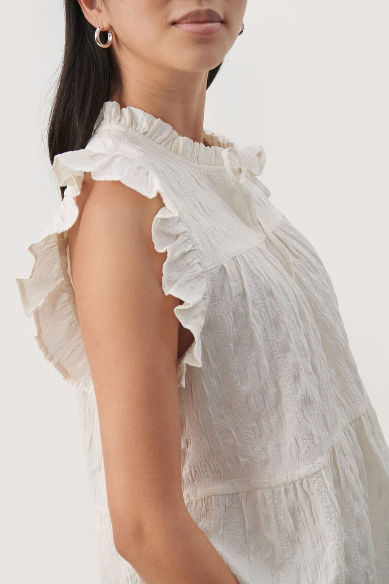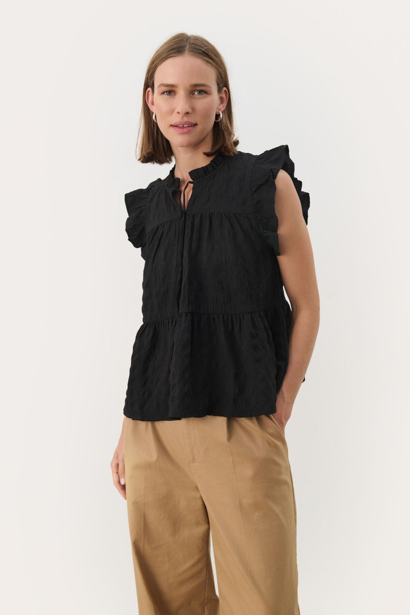 Part Two Gimaline frillatoppi on kaunis, tyyliltään romanttinen ryppykankainen toppi kermanvalkoisena ja mustana. Topissa on ilmava ja väljä frillahelmainen malli, ja mausteena röyhelöt pääntiellä ja olkapäillä. Pääntiellä on edessä myös halkio ja nauhat, ja olkapään röyhelö luo pienen hihakkeen. Topin suloinen ilme sopii ihanasti hameisiin ja juhla-asuihin, mutta myös rennosti vaikkapa farkkushortsien kanssa!