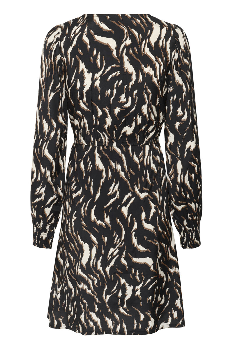 Kaffe Mille paitamekossa kaunis ja ihanan helppo malli sekä laskeutuva mustapohjainen kangas, joka on kuvioitu konjakinruskealla ja beigellä. Mekossa on v-pääntie ja napitus alas asti, ja ihanan runsaissa hihoissa on joustavat smokkirypytetyt hihansuut. Vyötäröllä on katko, jonka kohdalla etuosassa on kapea naruvyö. Selässä katko muuttuu kuminauhaksi, joten selkäpuoli joustaa, mutta etuosa on suora. Tämä malli saa mekon istumaan vyötäröltä kauniisti – tämä mekko on helppo kaikille vartalotyypeille! Vyön voi asetella etu- tai selkäpuolelle. Mille paitamekon lyhyempi malli on ihanan raikas valinta arkimekoksi!