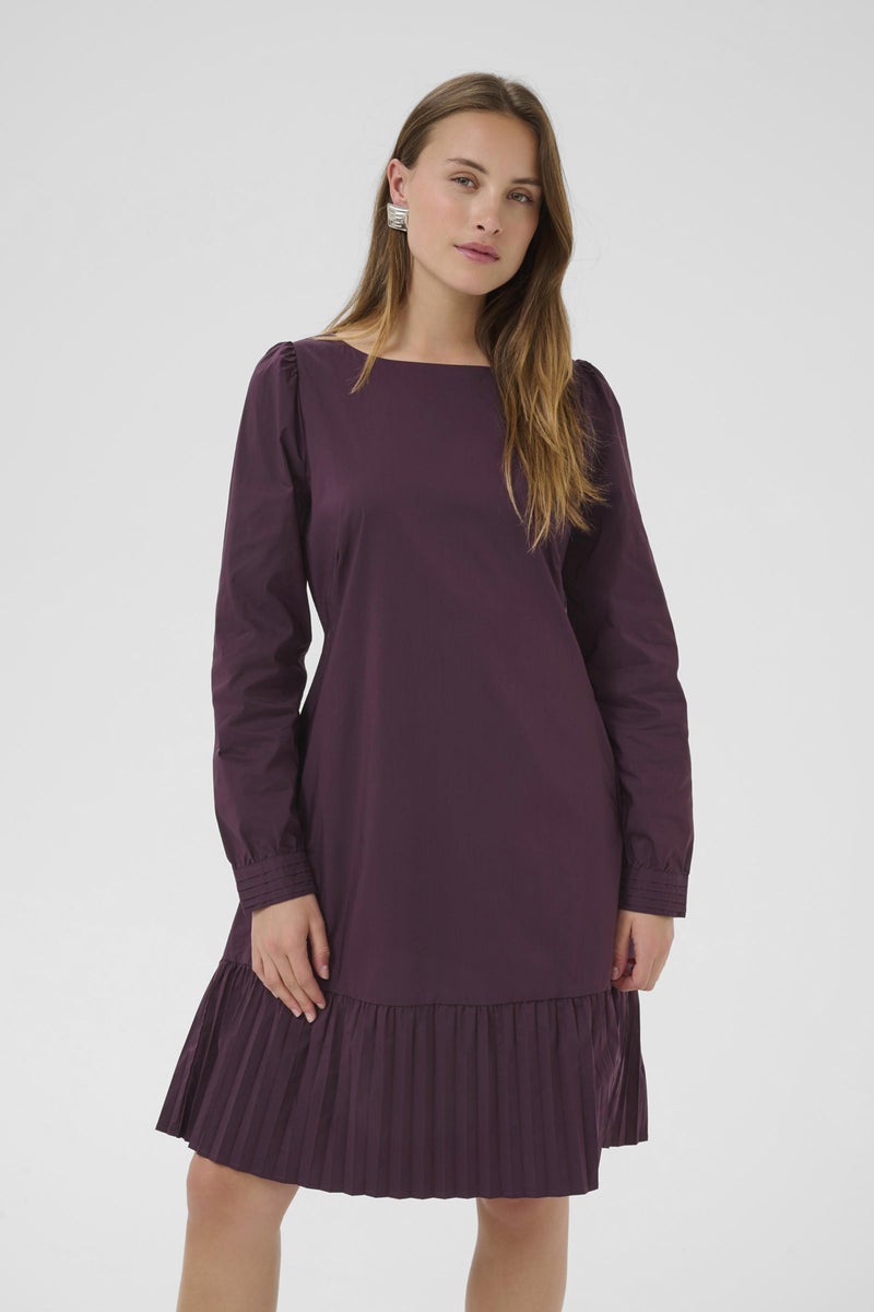 Culture Beate Antoinett mekko on tuttuun Antoinett-sarjaan kuuluva, rento ja helppo lyhytmallinen mekko mustana ja viininpunaisena. Tässä mekossa erikoisuutena on ihana pliseehelma! Vuoriton kangas on joustavaa, ja mekossa on rennot taskut, jotka ovat hauskasti eteen käännetyn sivusauman kohdalla. Mekossa on venemäinen pääntie, vetoketju selässä ja pitkät hihat, joissa on mansetit ja koristeelliset napit sekä olkapäillä pientä rypytystä. Malli on yläosasta slimmattu, ja helma levenee.