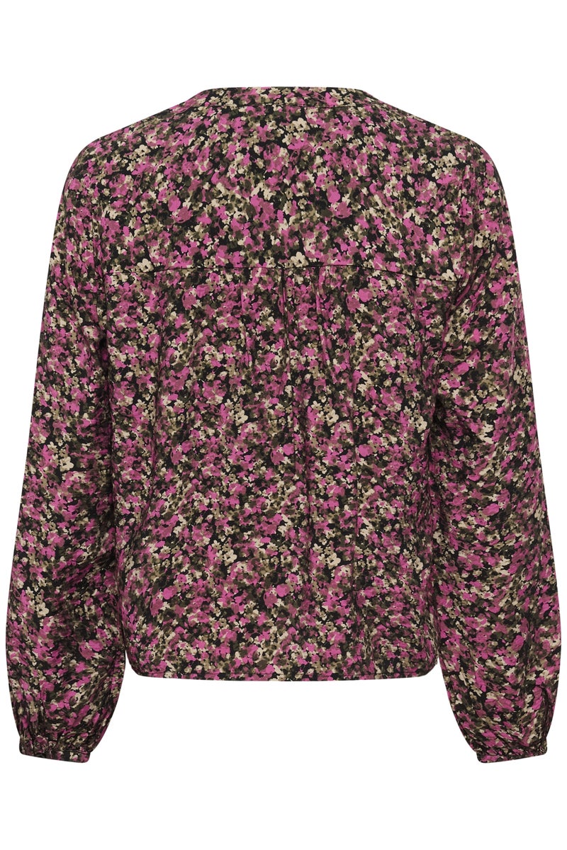 Kaffe Bella pusero hurmaa graafisella, siroista kukista inspiraationsa saaneella kuosilla. Ihanassa puserossa on suora perusmalli ja väljä v-pääntie. Kauniit pitkät hihat ovat kevyesti pussittavat ja hihansuissa on kuminauhat. Hienovarainen rypytys selkäsaumassa tuo puseron takaosaan kevyttä ilmavuutta ja naisellisuutta. Tämän puseron yhdistät helposti niin hameisiin kuin housuihin ja se sopii myös jakun alle.