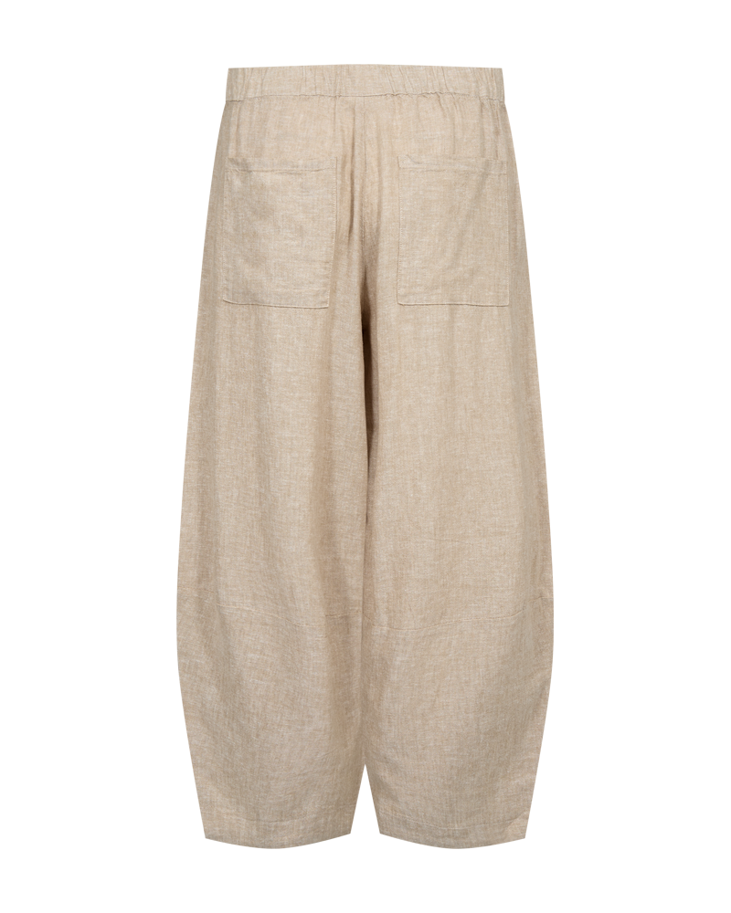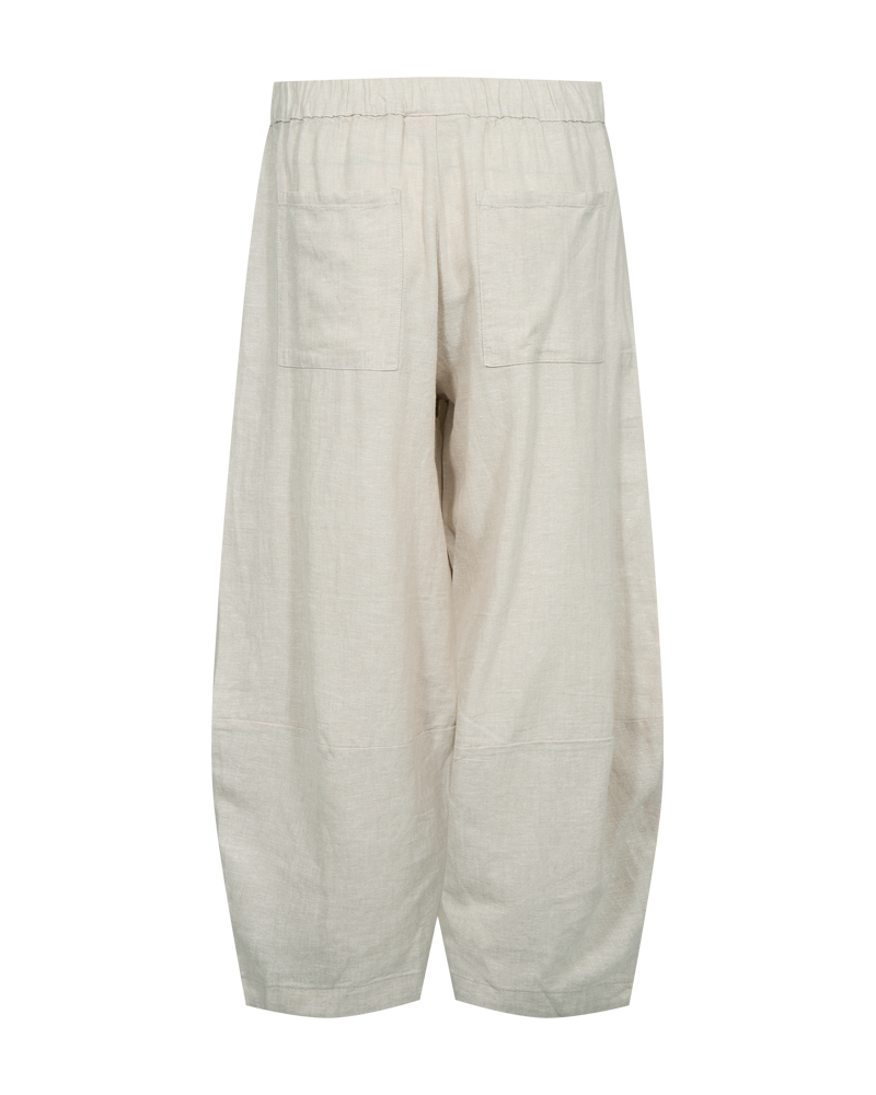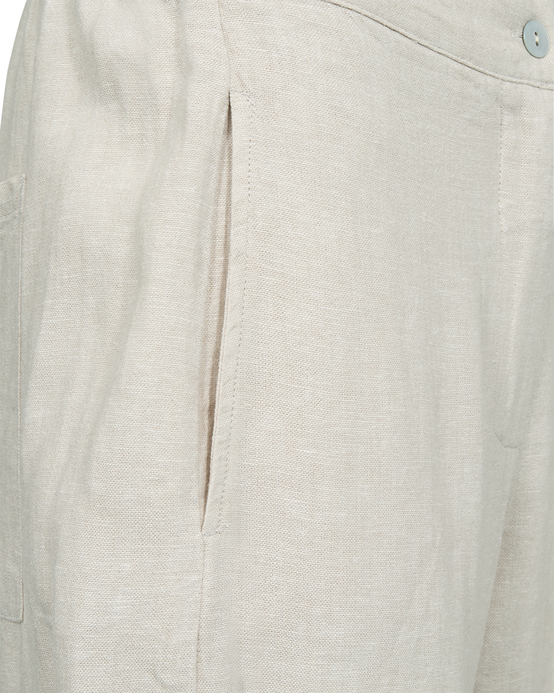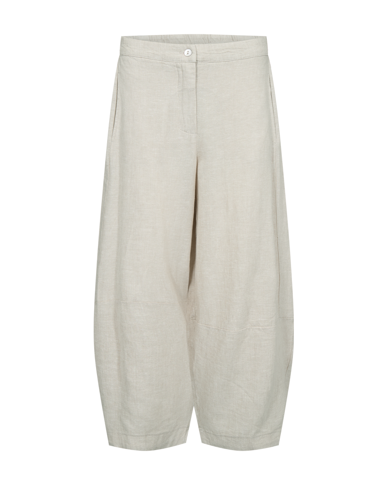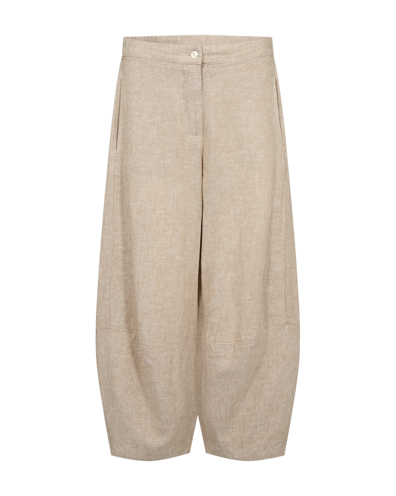Freequent Lava Barrel housut hurmaavat ihanissa vaalean beigen ja kitin sävyissä. Rennoissa kesähousuissa on korkeavyötärö, siisti vetoketju- ja nappikiinnitys sekä vajaamittaiset, nilkkaa kohti kapenevat lahkeet. Väljä malli on viimeistelty sivutaskuilla ja takataskut ovat kivasti päälle ommeltu. Materiaali on mukavan vilpoista pellavaviskoosia. Pue bleisereiden ja neuleiden kanssa, tai yhdistä ihaniin Lava-sarjan yläosiin!